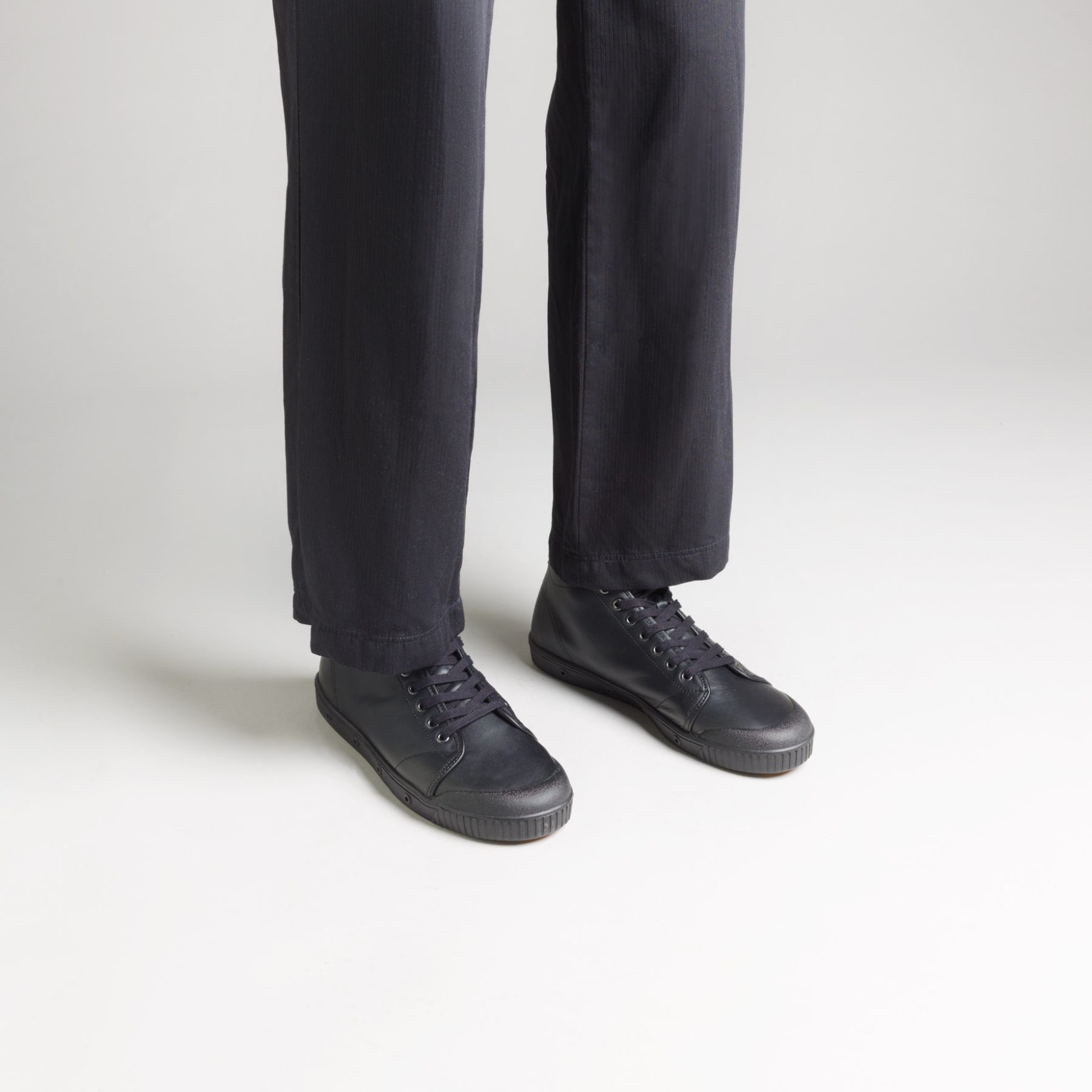 Black leather high top trainer. Sheepskin leather meeting Reach standards.
